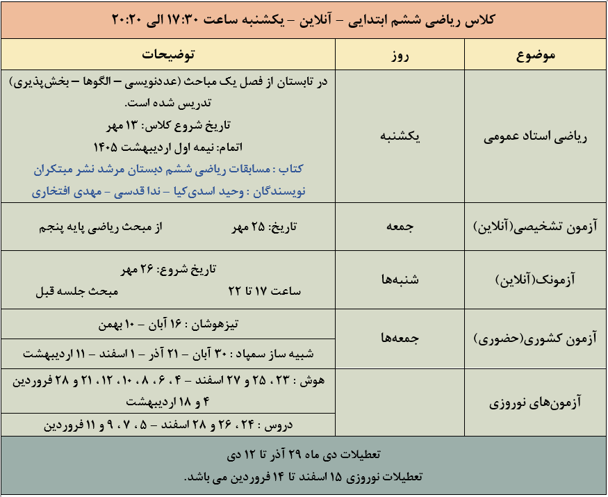 کلاس ریاضی ششم آنلاین – یکشنبه (استاد عمومی)