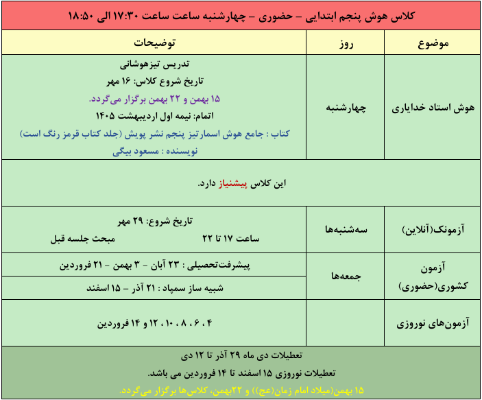 کلاس هوش پنجم حضوری – چهارشنبه (استاد خدایاری)