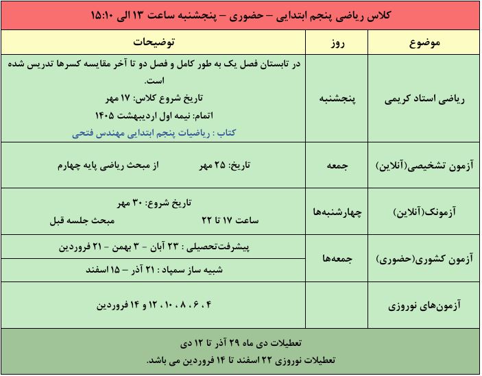 کلاس ریاضی پنجم حضوری – پنجشنبه (استاد کریمی)