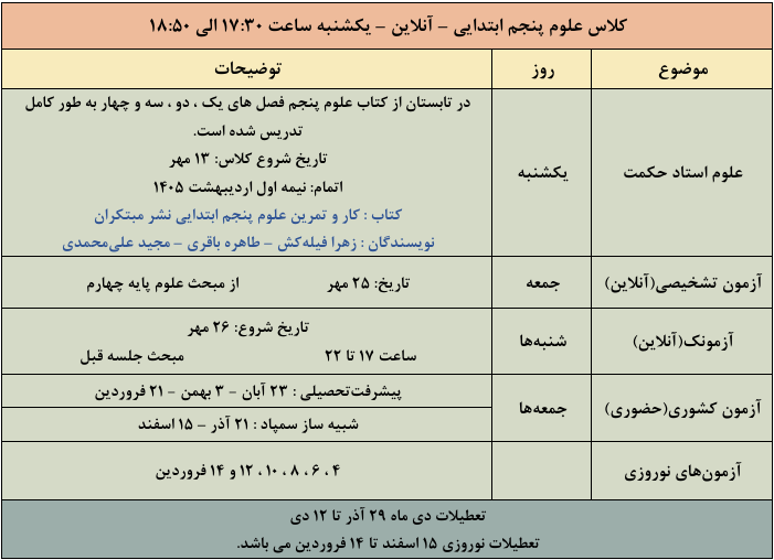 کلاس علوم پنجم آنلاین – یکشنبه (استاد حکمت)