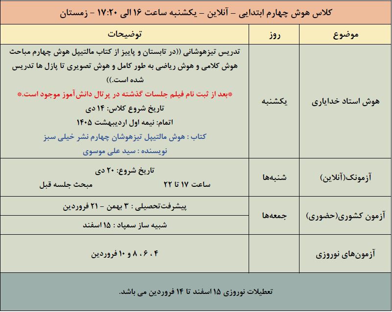 کلاس هوش چهارم آنلاین – یکشنبه (استاد خدایاری)