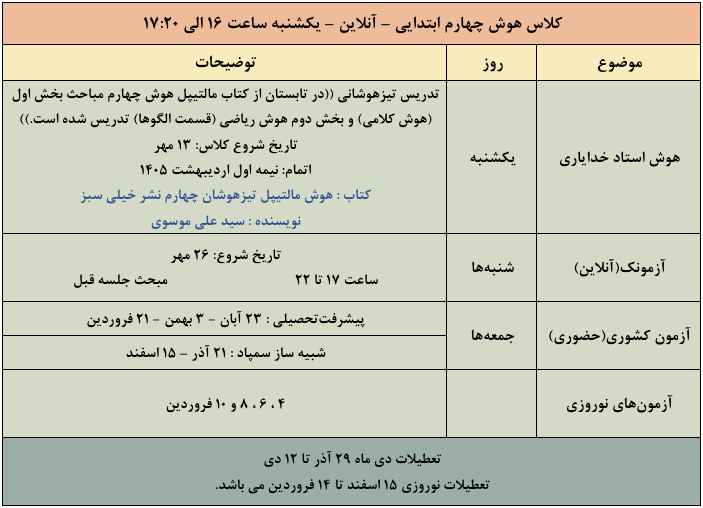 کلاس هوش چهارم آنلاین – یکشنبه (استاد خدایاری)